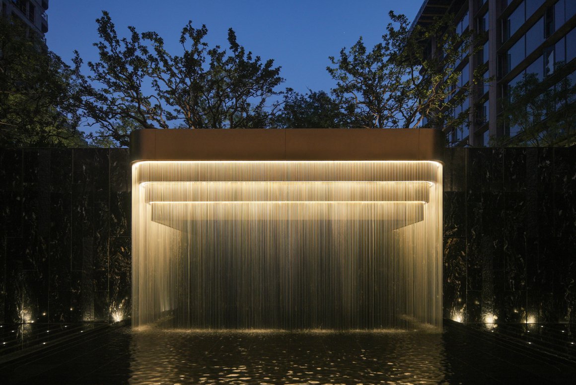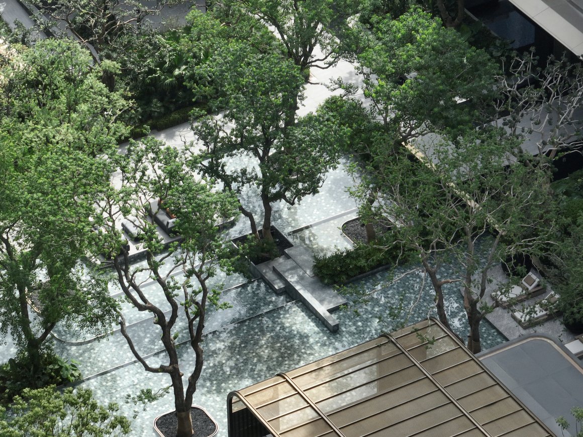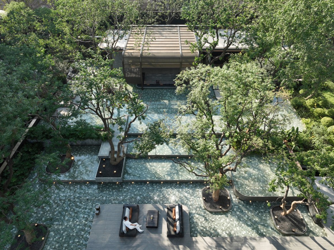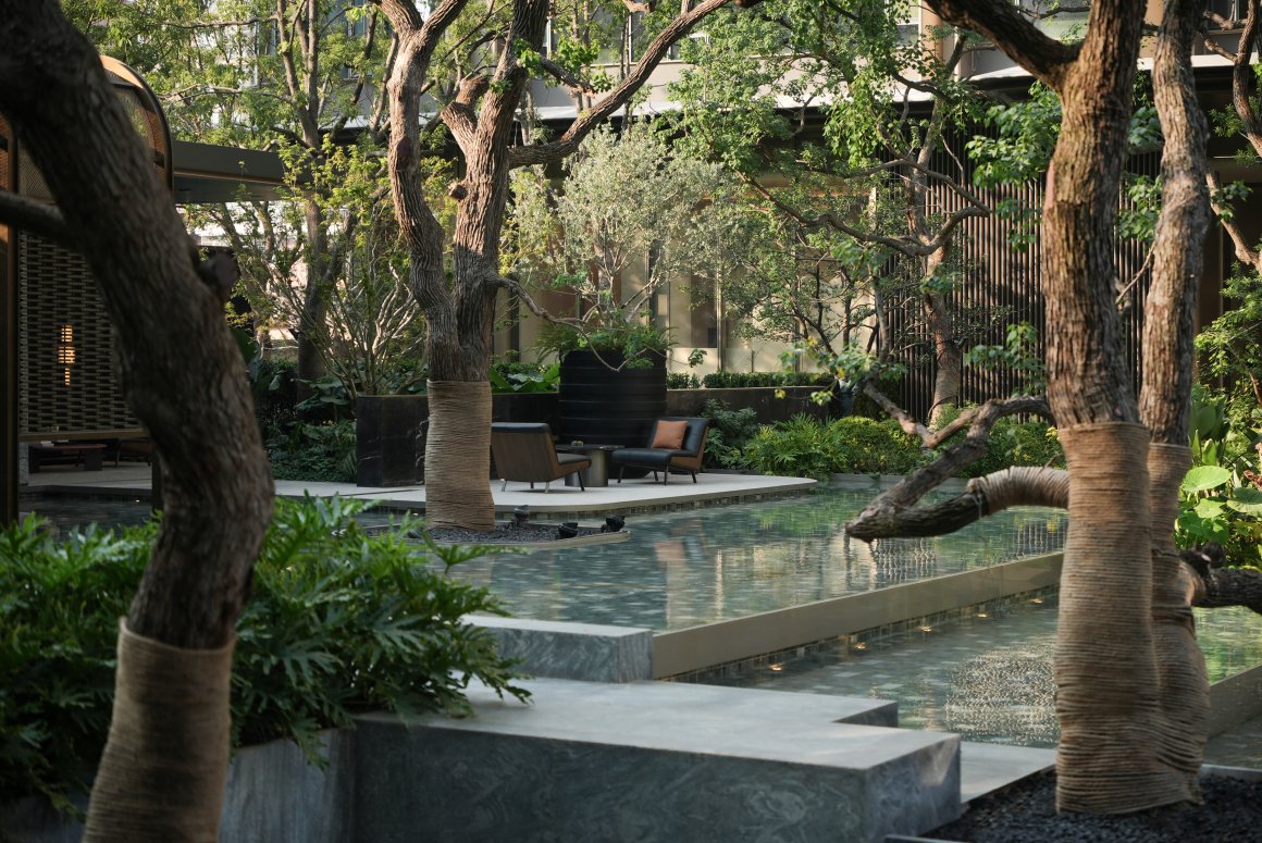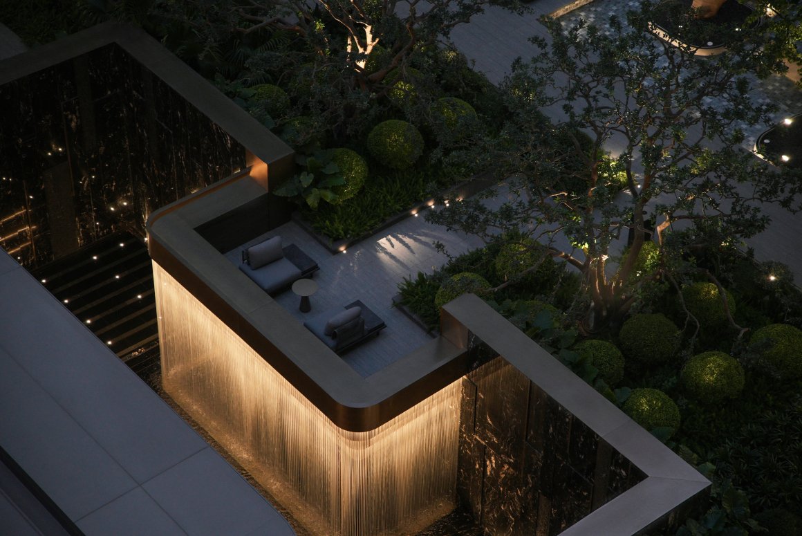 Behind it, the tall tree plantings and water features of the upper courtyard’s central water garden form a harmonious interplay. The layered vegetation and abundant greenery enhance the landscape’s quality, seamlessly blending the flowing water with a sense of serene tranquillity. This creates an environment where movement and stillness coexist in perfect balance.
