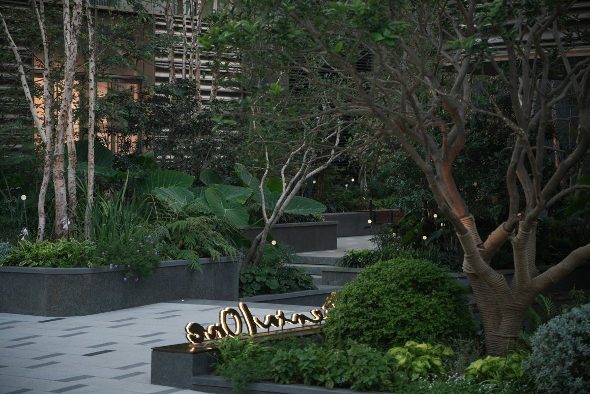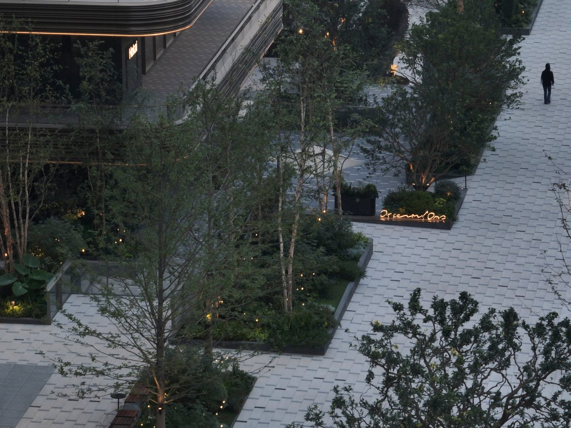 背后,上层后场中心水院的乔木绿化与水景相映成趣,通过植物的层次感与绿意的渗透,进一步丰富了空间的景观质感,并在视觉上营造出一种流动与静谧交织的环境体验。