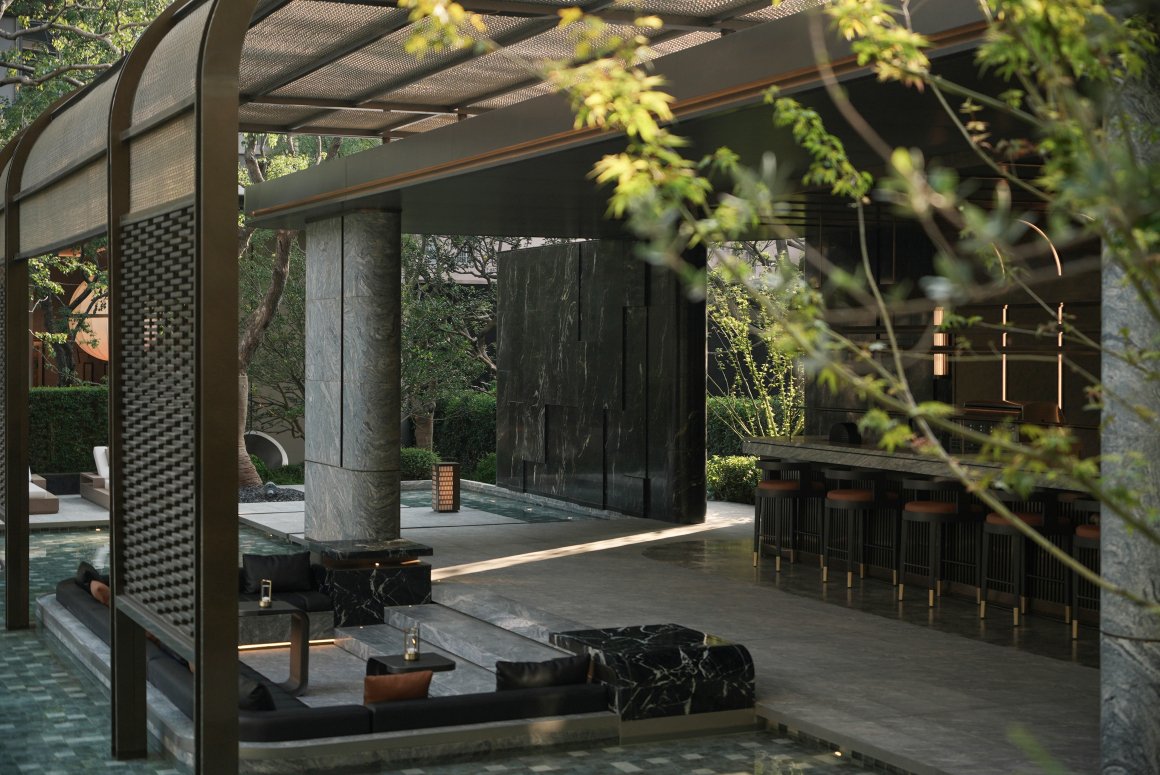 泛泳池(浅水池,以泳池的概念出现)作为社区的核心区域,位于空间的中心位置,我们设计了一座高端户外酒廊(Whiskey Bar),为业主提供了一个雅致且富有社交氛围的场所。不仅突出了社区的社交属性,还通过精致的景观布局和功能划分,提升了居住体验的整体品质。