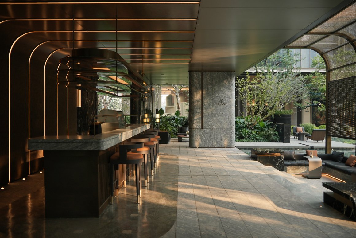 Adjacent to the whiskey bar are a dining bar, water bar, garden discussion area, and waterfront leisure zone, together creating a multifunctional space for socializing and relaxation.