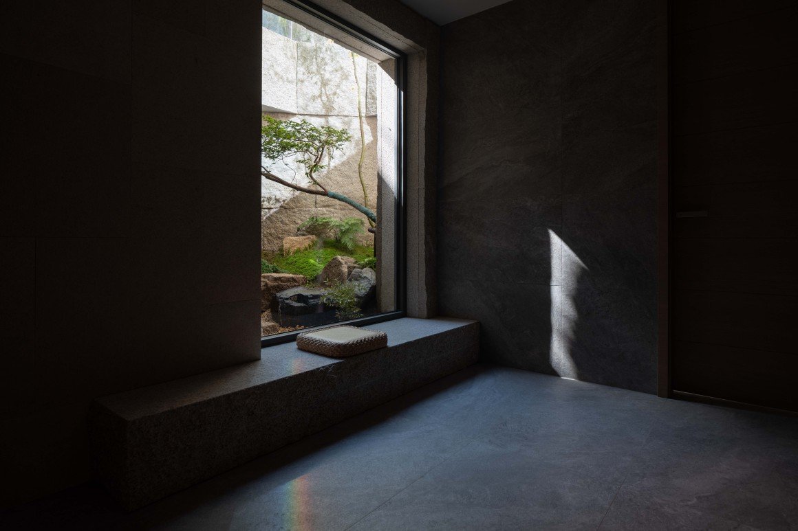 厚重的地下室墙壁变成了自然的山体,犹如从石缝中生长出的杜鹃与山石草木构成了一幅绝美的框景。