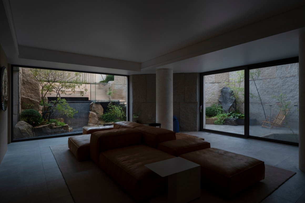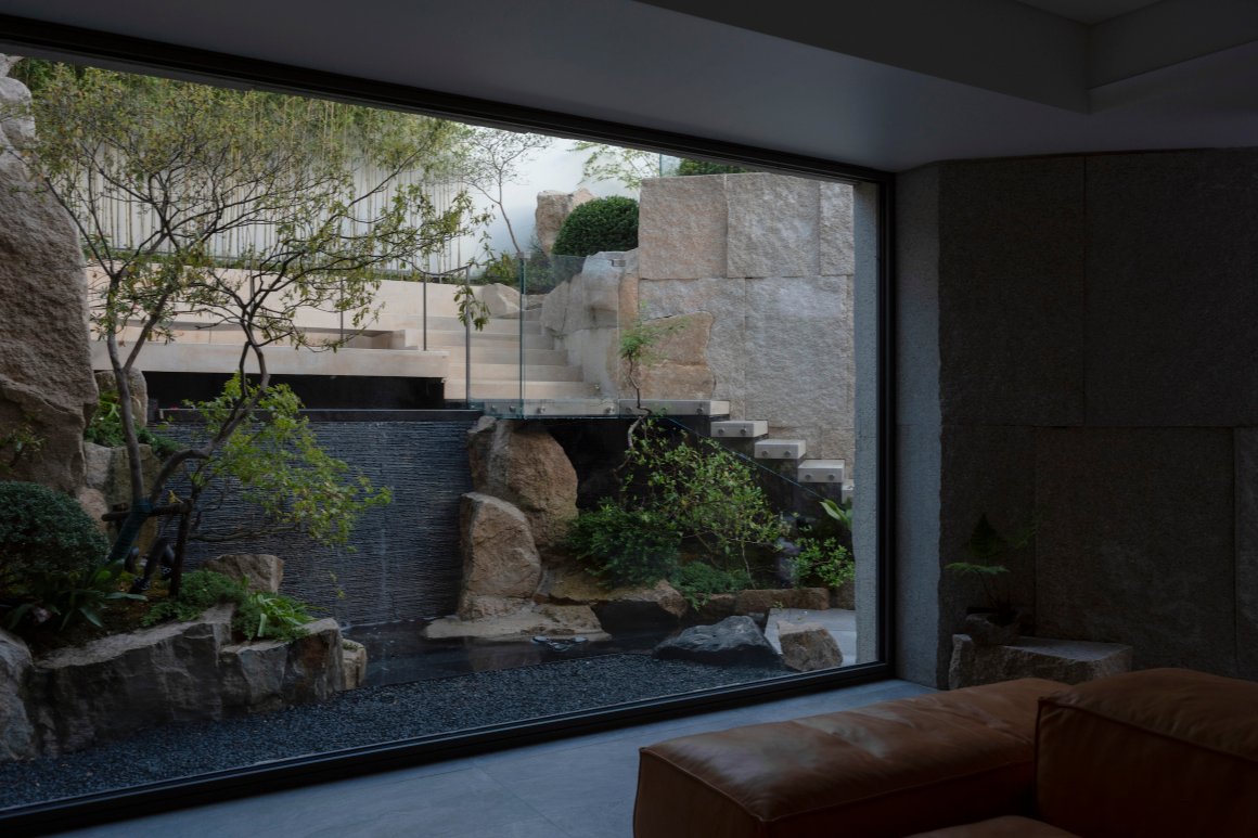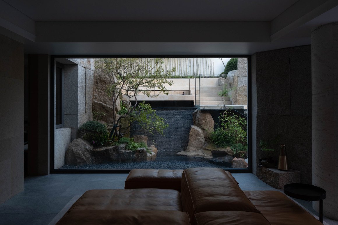 Passing through the courtyard garden on the negative second floor, we will enter the reception room on the negative first floor.The main scene of the living room is set with a stream stacked stone, the tall stone is integrated with the rock wall, the building grows naturally from the mountain wall, the stream falls from the upper level into the main picture frame, the mountain stone and the plant echo.