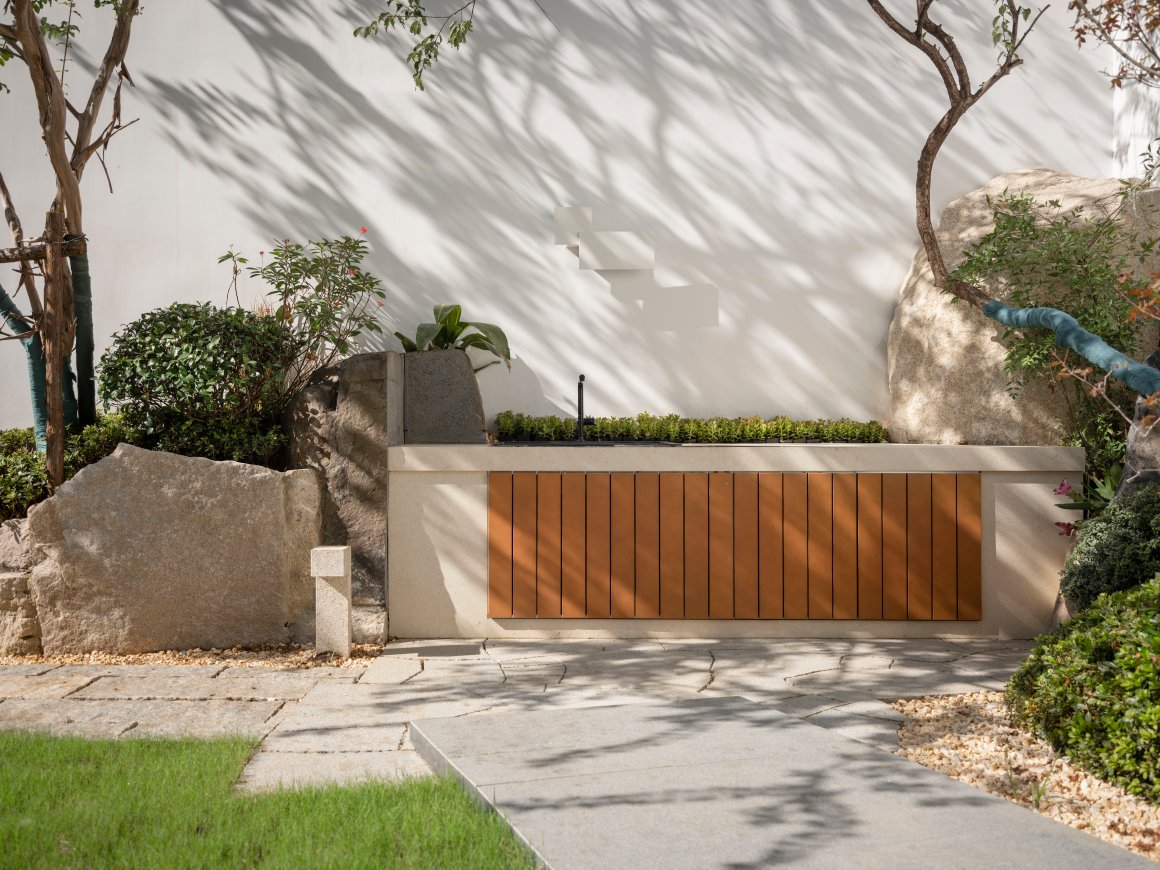 花园不仅是能让主人在花园中游走观赏,视觉上能让人愉悦,也是需要可以停留和和聚会的空间。从登山道往上可以进入到卡座休闲区,其是户外唯一的固定休闲活动区域,与叠水之上,可凭栏观景亦可端坐于火炉旁,当天气微凉,温暖的火光微微摇曳,几杯暖茶,三五碟点心,一家人围炉而坐,欢声笑语 其乐融融!