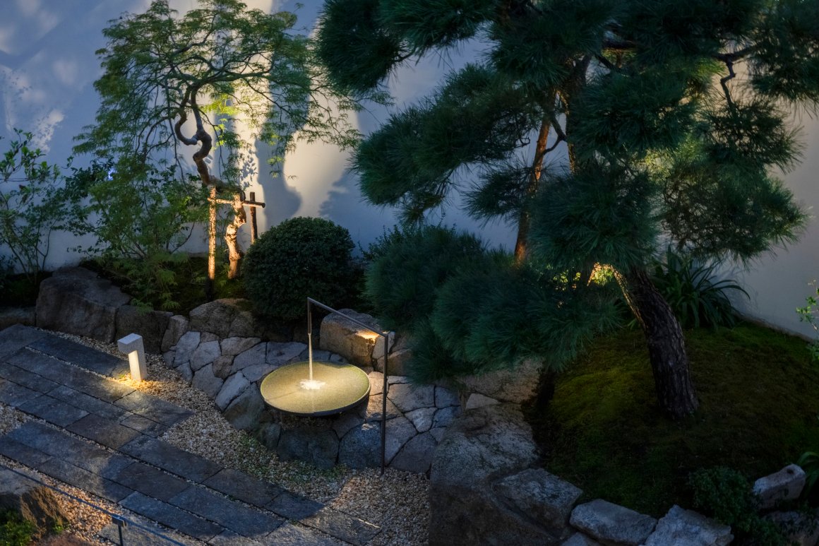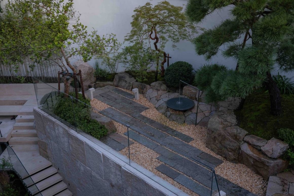 自然的毛石堆砌树池,老石板的地面铺装,包括流水装置的设计,黑松,羽毛枫的搭配,整体以一种自然东方的风格与建筑融合。