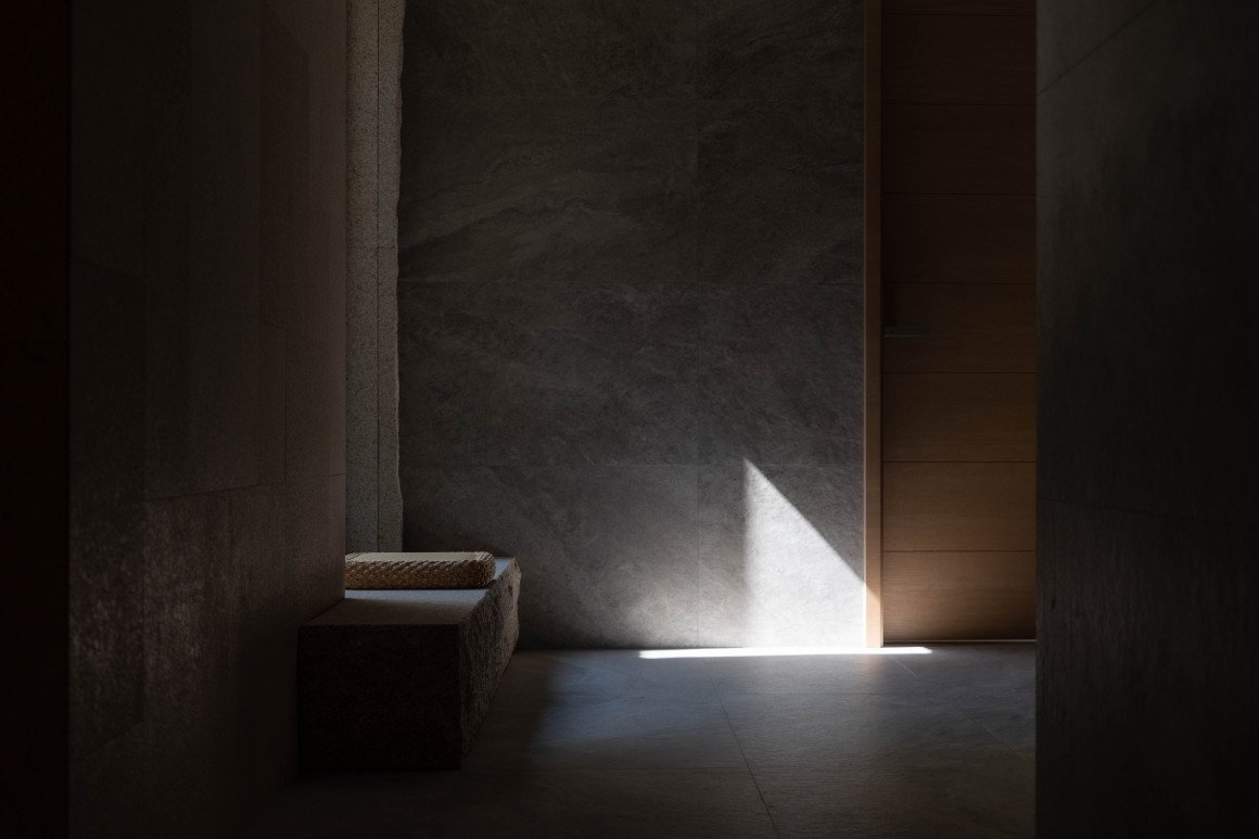 穿过负二层天井花园,我们将进入位于负一层的会客厅。会客厅主景设置了溪流叠石,高大的置石与岩石的墙壁融为一体,建筑从山体岩壁中自然生长出来,溪流从上层跌落进入主景画框之中,山石与植物交相呼应。