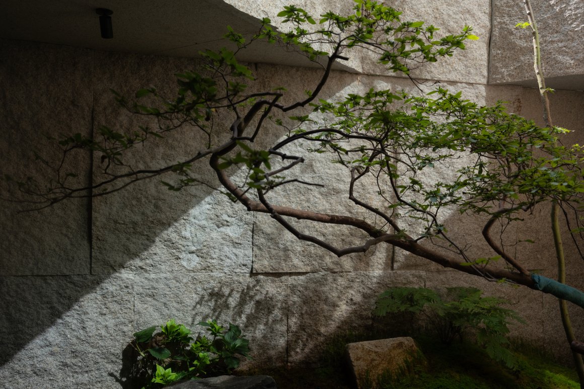 下沉花园的挡墙用自然面的花岗岩进行了处理,我们希望无论是从室内看向室外;或是进入到花园之中,都仿佛置身于自然,岩石墙面代替了山体岩壁,悬挑的楼梯从岩石峭壁中开凿而出,飘逸而青翠的植物在山石溪谷中舒展。