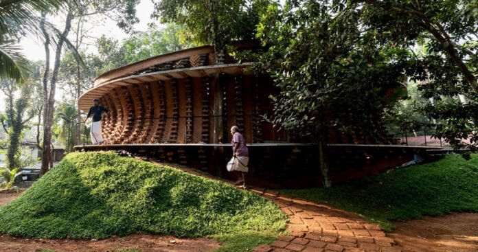 Located in Vadakara, a town in India known for its high toy consumption, Wallmarkers’ Toy Storey Residence embraces a circular design philosophy. Accessible from all sides, the house features a playful verandah supported by a unique combination of discarded toys and traditional Mangalore tiles. This cantilevered structure, held aloft by corbeled toys, embodies the concept of a house without a designated front or back, fostering a sense of openness and community. The positioning of the house is dictated by the presence of three large trees and the slope of the site.