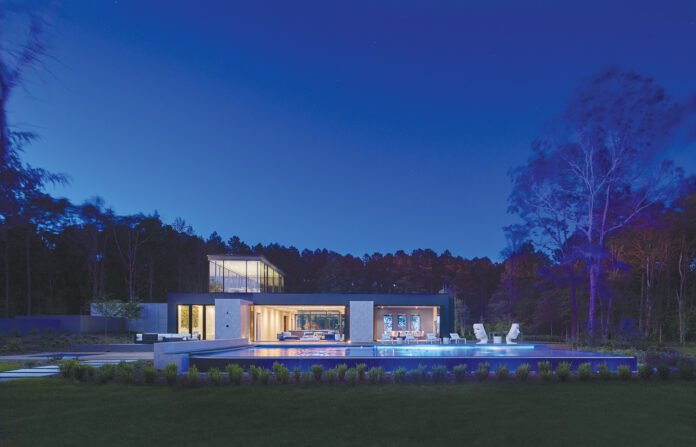 As the project neared completion, landscape architects Ryan Moody and Nick Wittkofski of Moody Graham joined the team. “We pulled the amazingly strong concepts that Todd and Ana developed into the landscape and pulled some of the forest back into the site,” says Moody. Focusing on native species, they planted the berm with silvery mountain mint and fringed the pool terrace with Virginia sweetspire, oakleaf hydrangea and Russian sage.