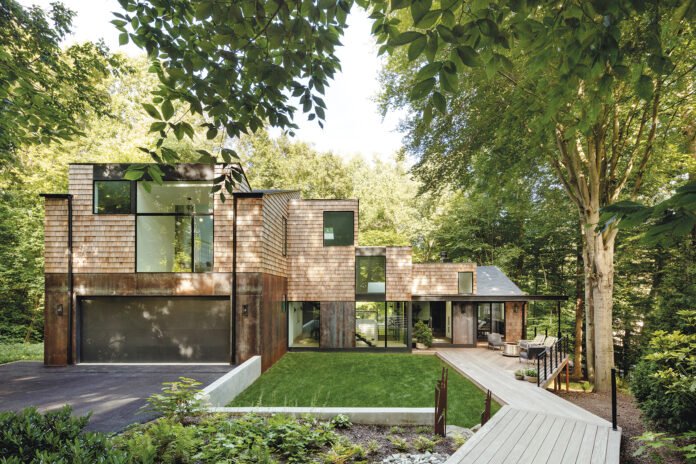 The overhaul married the architect’s industrial-modern instincts with the clients’ nature-driven values. Dubbed Corten Tree House, the dwelling is notable for its exterior of rust-red, weathered-steel panels and cedar shakes recycled from the original structure. Completed in 2021, the redesign added 1,000 square feet to what is now a six-bedroom, five-and-a-half-bath dwelling. Angled, sky-lit ceilings peak at 15 feet and glazed openings bring the outdoors into the heart of the home.