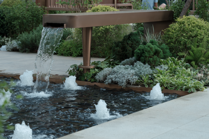 这里作为展示区的第一重礼遇,以强有力的昭示性营造城市友好的气质界面。“L 型”几何语素的延伸设计,让整个空间更加广阔,同时隐喻着空间转换的延续。叠级水景与充满体量感的植物花池穿插,增强空间的视觉吸引力和焦点感。