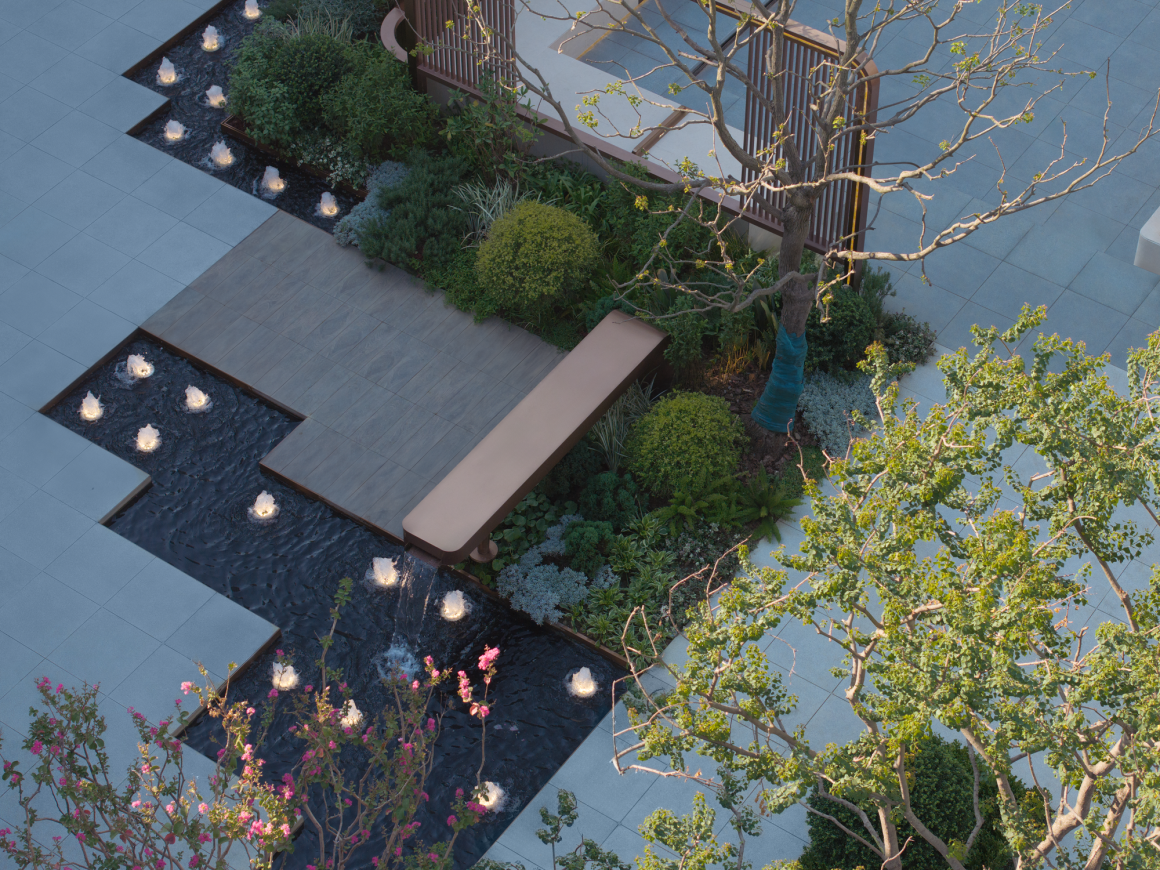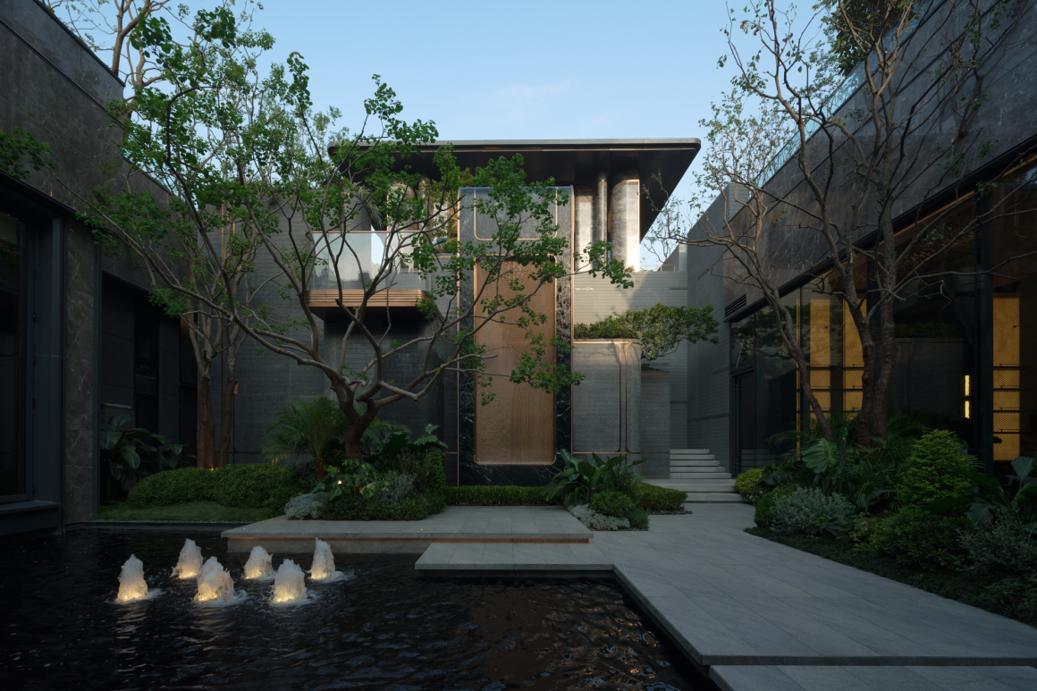 Across the front square from the sales office,Arriving at the Art Court,Landscape wall combined with stacked water space,Opening the first act of courtyard life.Up the stairs, strolling through the courtyard,Various forms of hedges are vividly interspersed in the site,The scenery is differentThrough the mountain scenery,Feel the style artistic conception space.