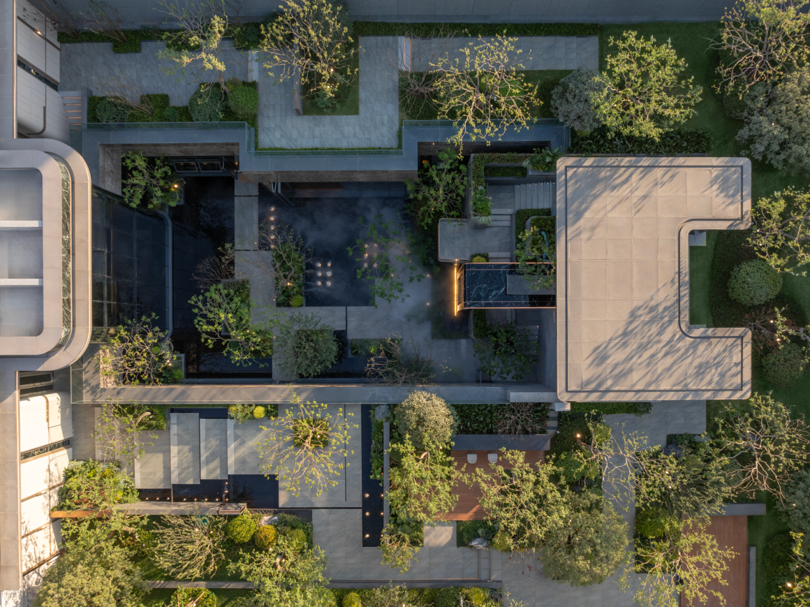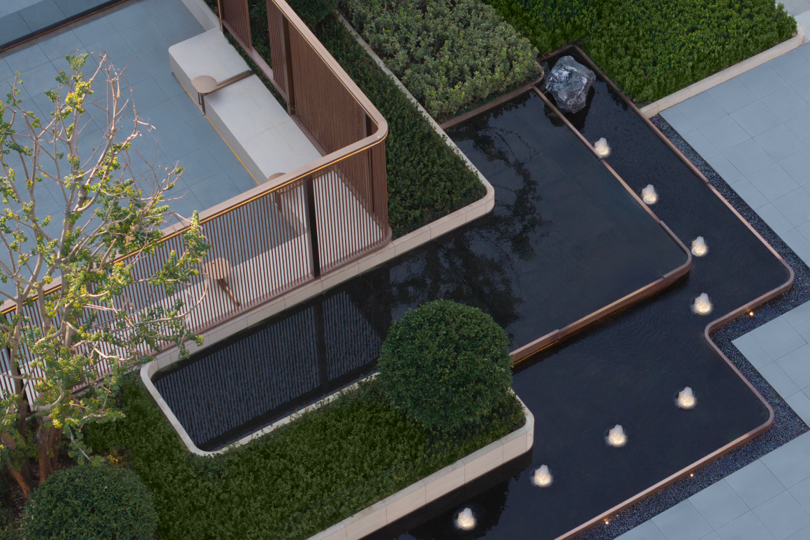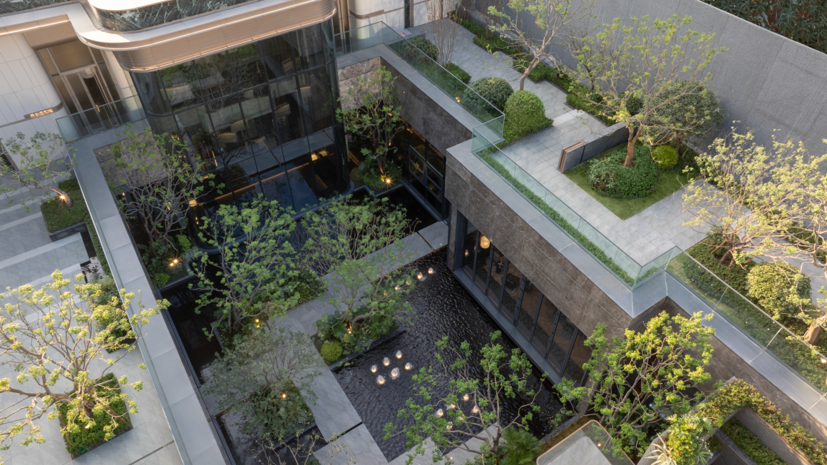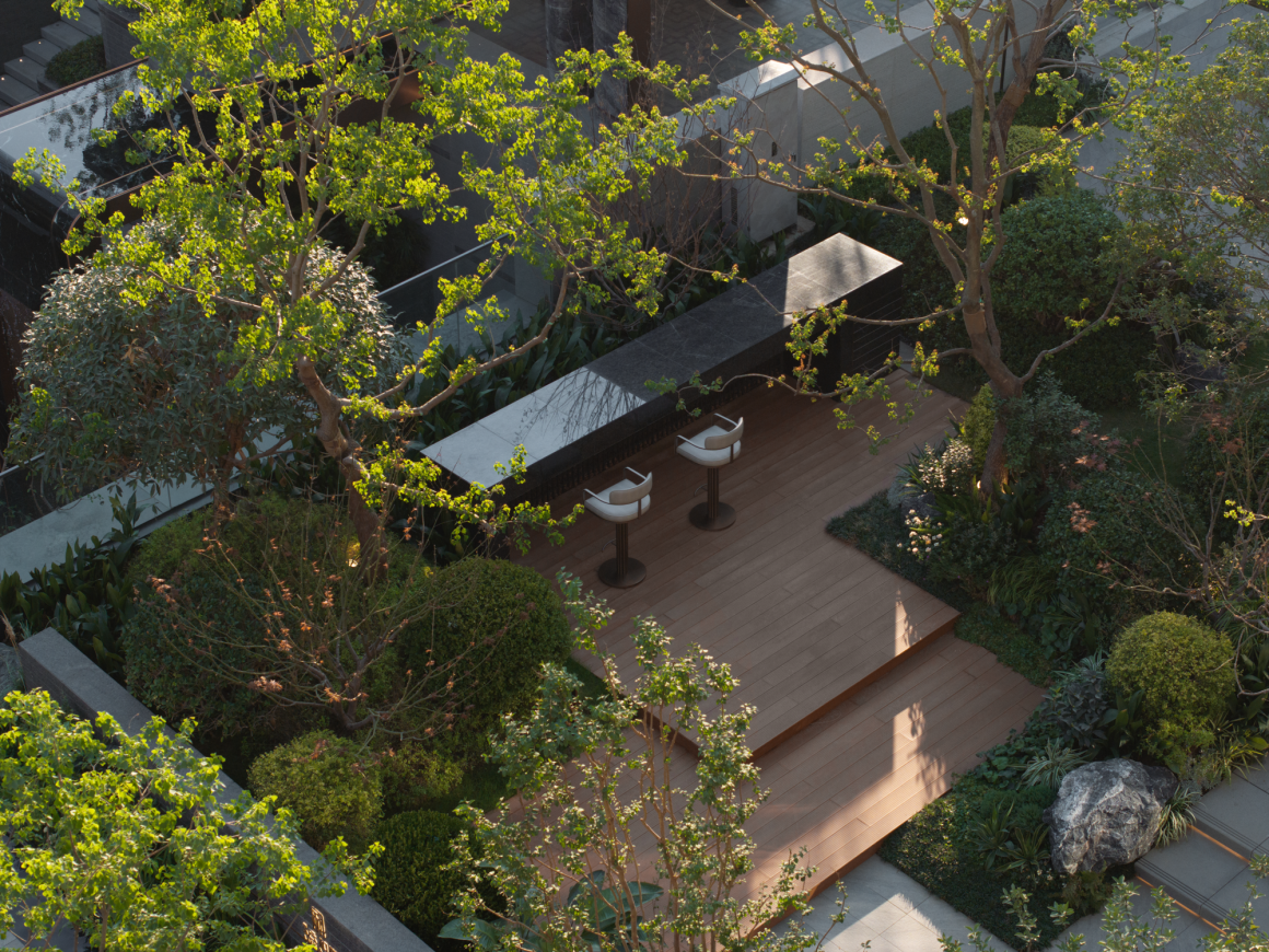 我们融合城市气质,萃取场地特征,希望将城市烟火气与小资情调融合至花园景观,打造一个与自然共吟、花园度假式的居住生活体验空间。以“入庭艺居”为设计理念,搭建无限奢享的五大生活场景,四大景观空间——四时林语、循影庭院、拾光归屿、橼下听瀑。
