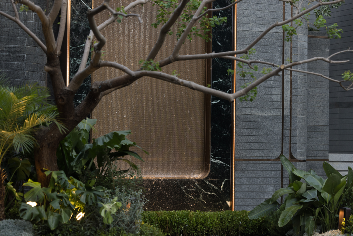 This is the first privilege of the exhibition area,Create a city-friendly temperament interface with a strong declarative character.Extended design of “L-shaped” geometric morphemes,Make the whole space wider,At the same time, it is a metaphor for the continuation of spatial transformation.Cascade water features with a sense of volume,The plants of the flower pond interspersed,Enhance the visual appeal and focus of the space.