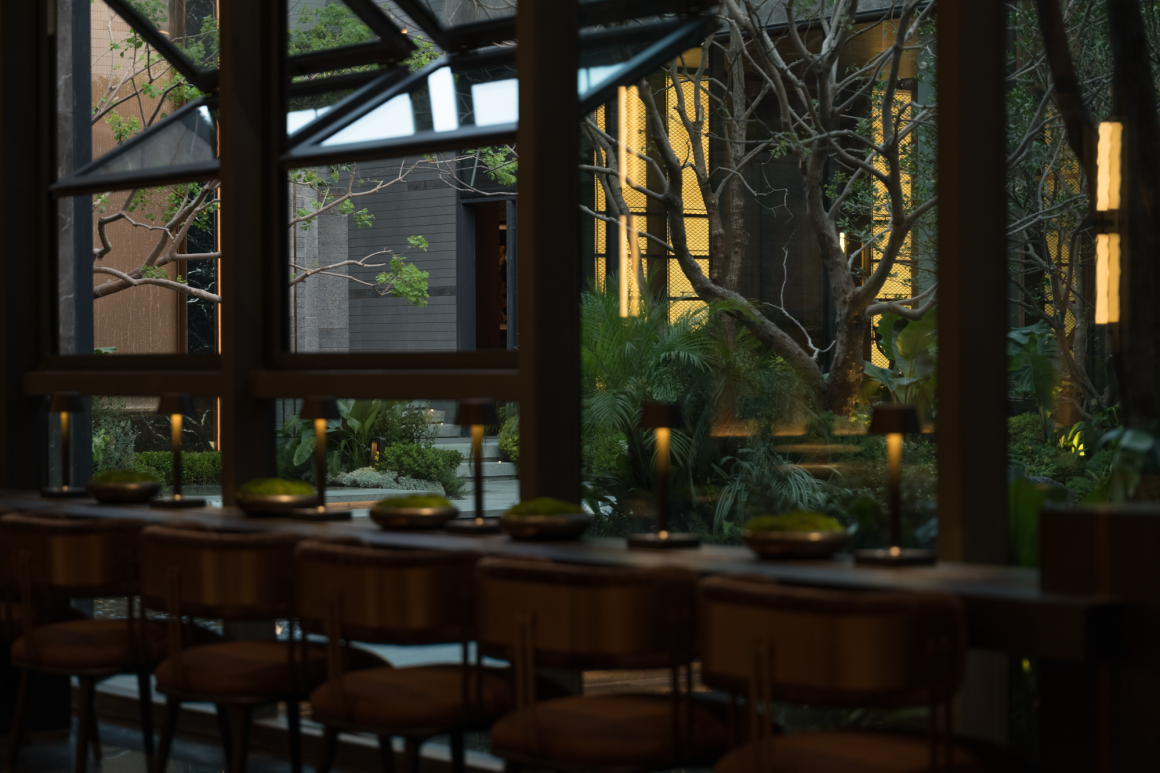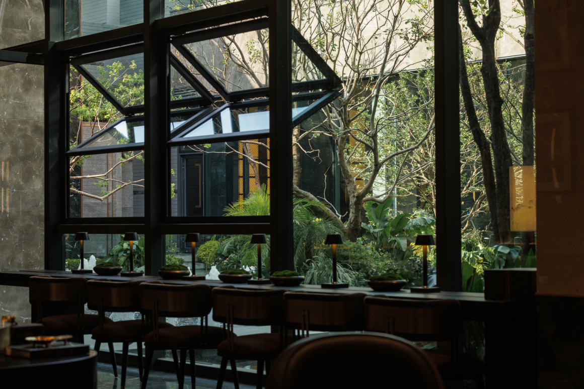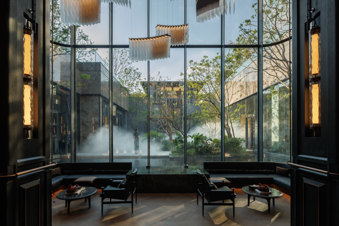 穿过入口空间,庭院上下两层之间,仿佛峡谷般的将山海藏纳其中,方寸之间,以亭为栖,以瀑为海,收藏自然,尽叙自然。