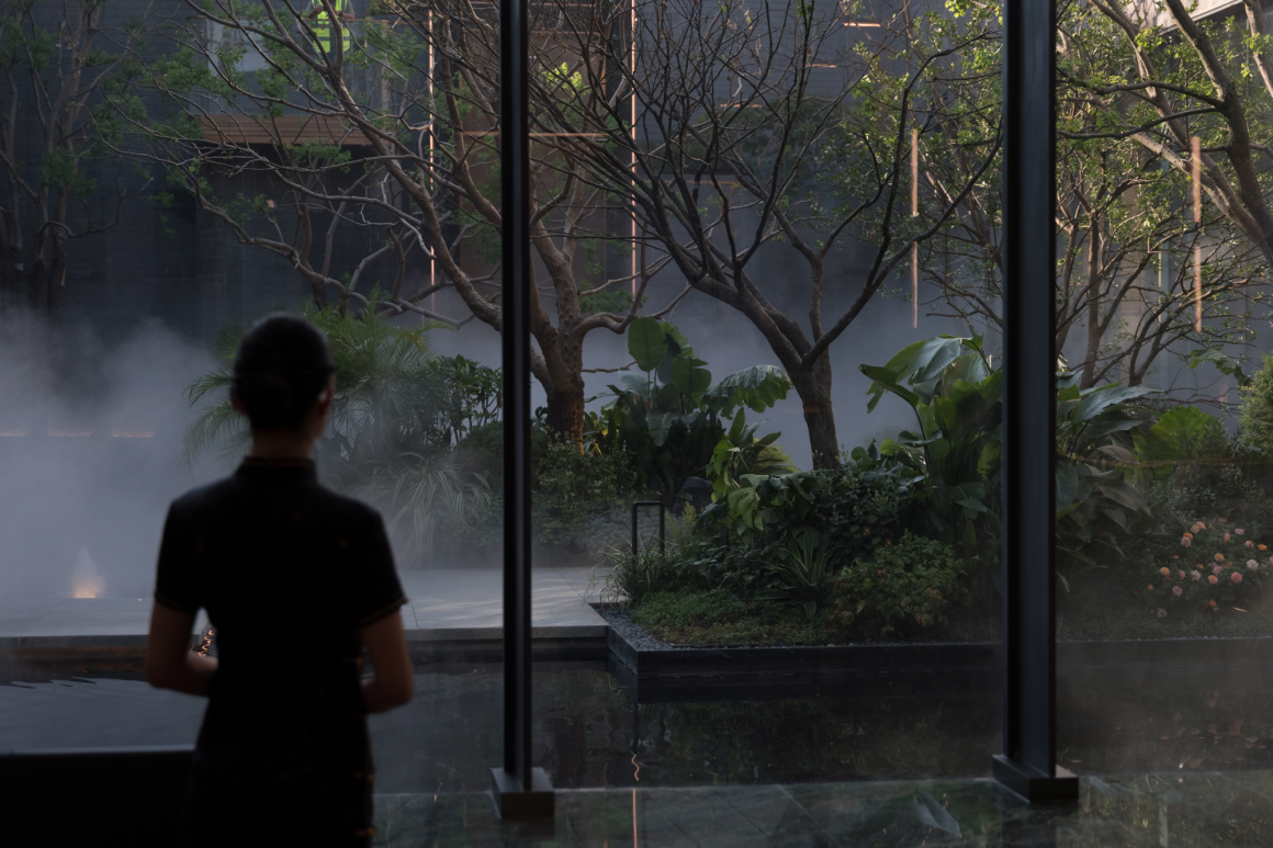 整个展示空间作为售楼处也是面向市政的公共空间,它的性质既是开放也是内引,向外是城市窗口,向内是雅致归家。因此,景观希望在此塑造一个体现领域感、腔调感与雅致感的城市综合展示空间,以现代的设计语言,衍生对现代都市生活的探索。