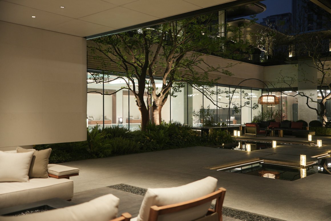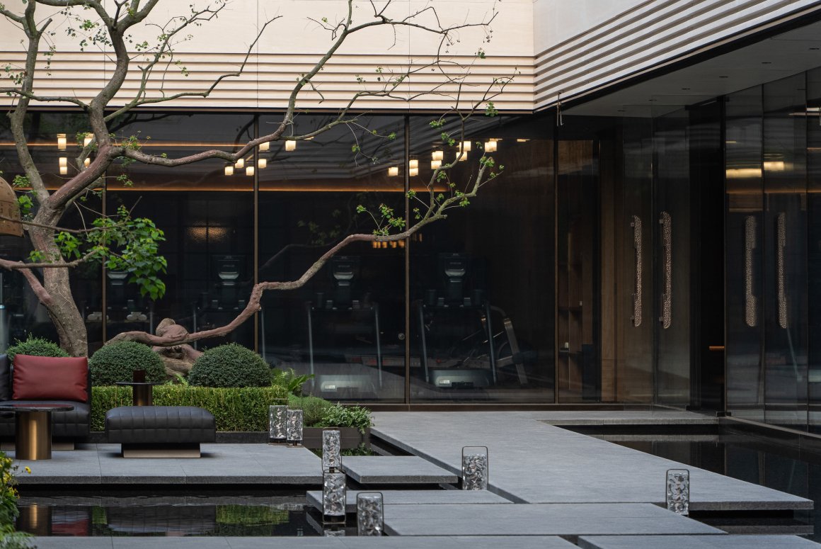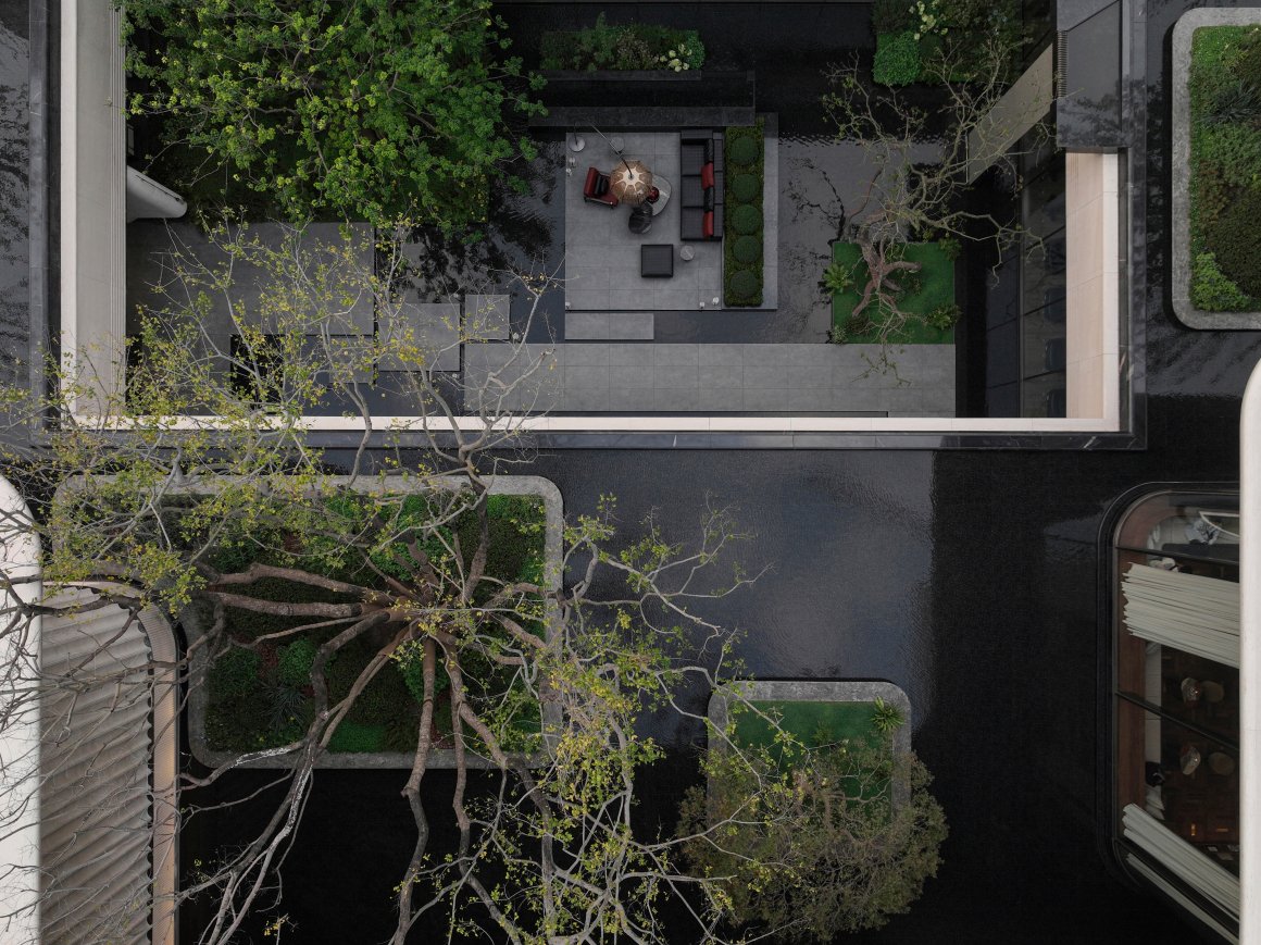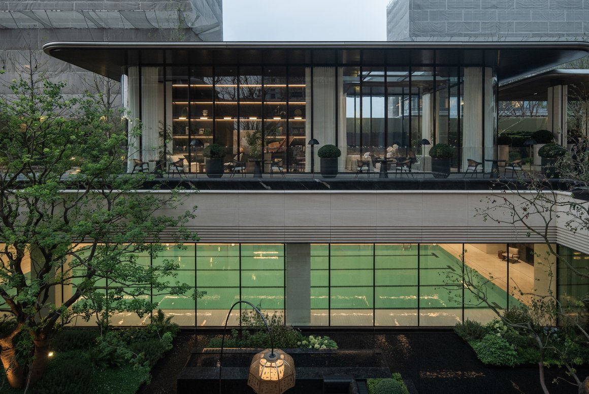 穿越艺术门厅后,随即展开的是宅邸第一进花园,以水院作为载体,串联周围的接待大堂、艺术回廊、花房沙龙会所以及负一层的绿宝石花园形成一个高密度、高显性的花园合院。花园,除了被围合起来体验,也应该能是自由流淌在开放空间里的、生动的生活场景。