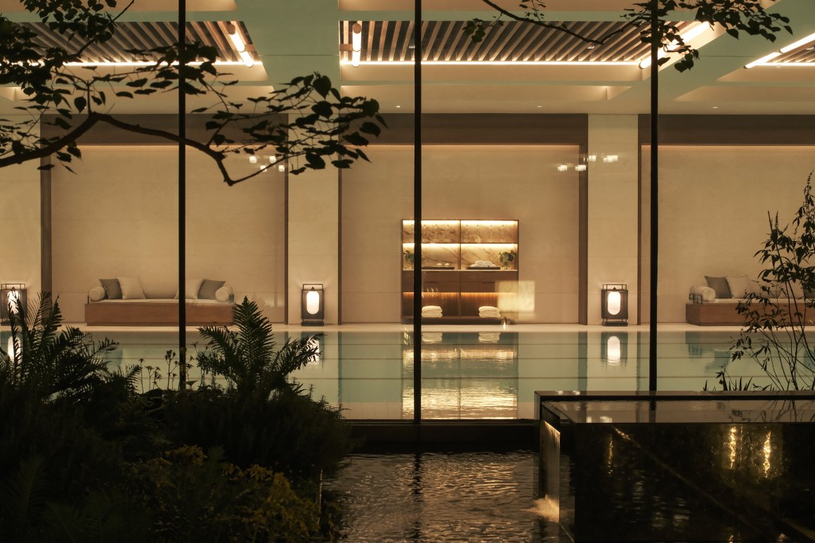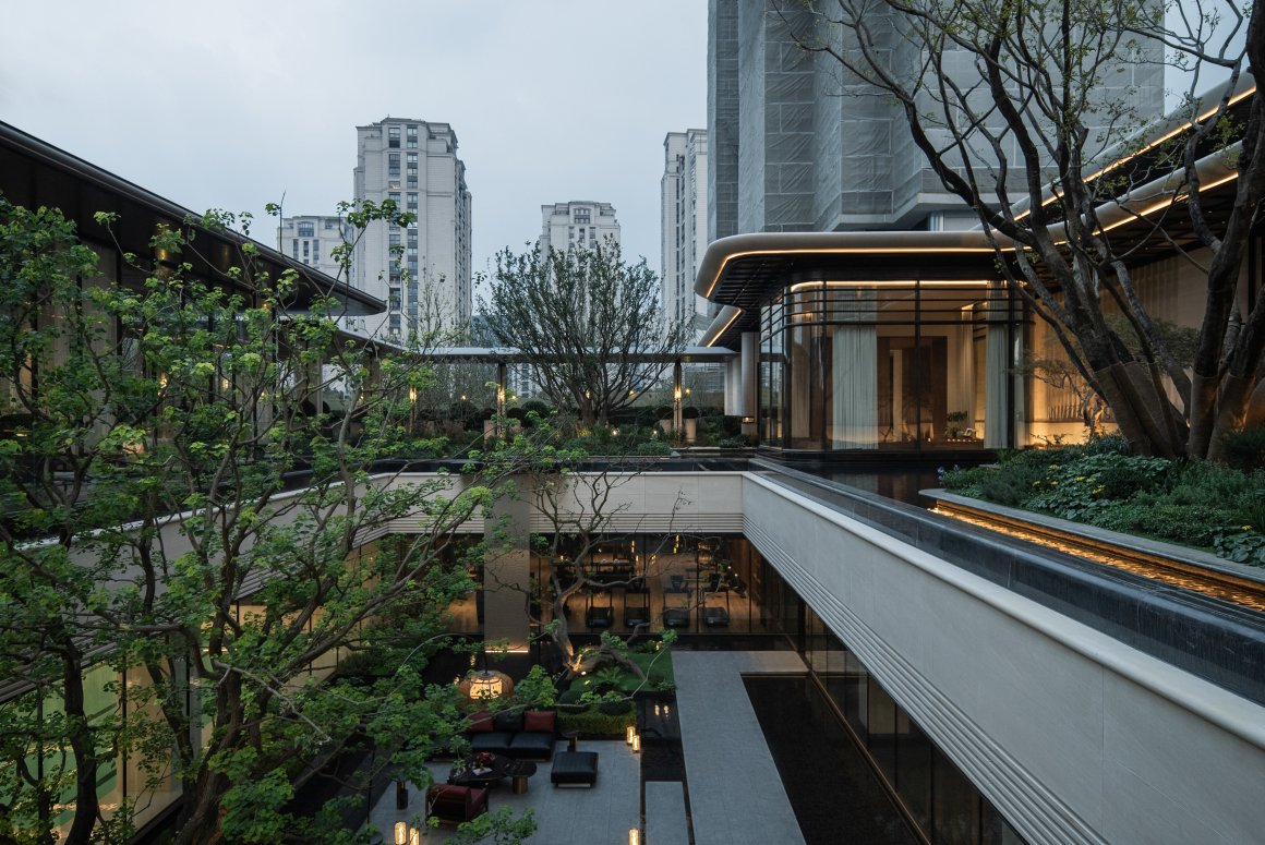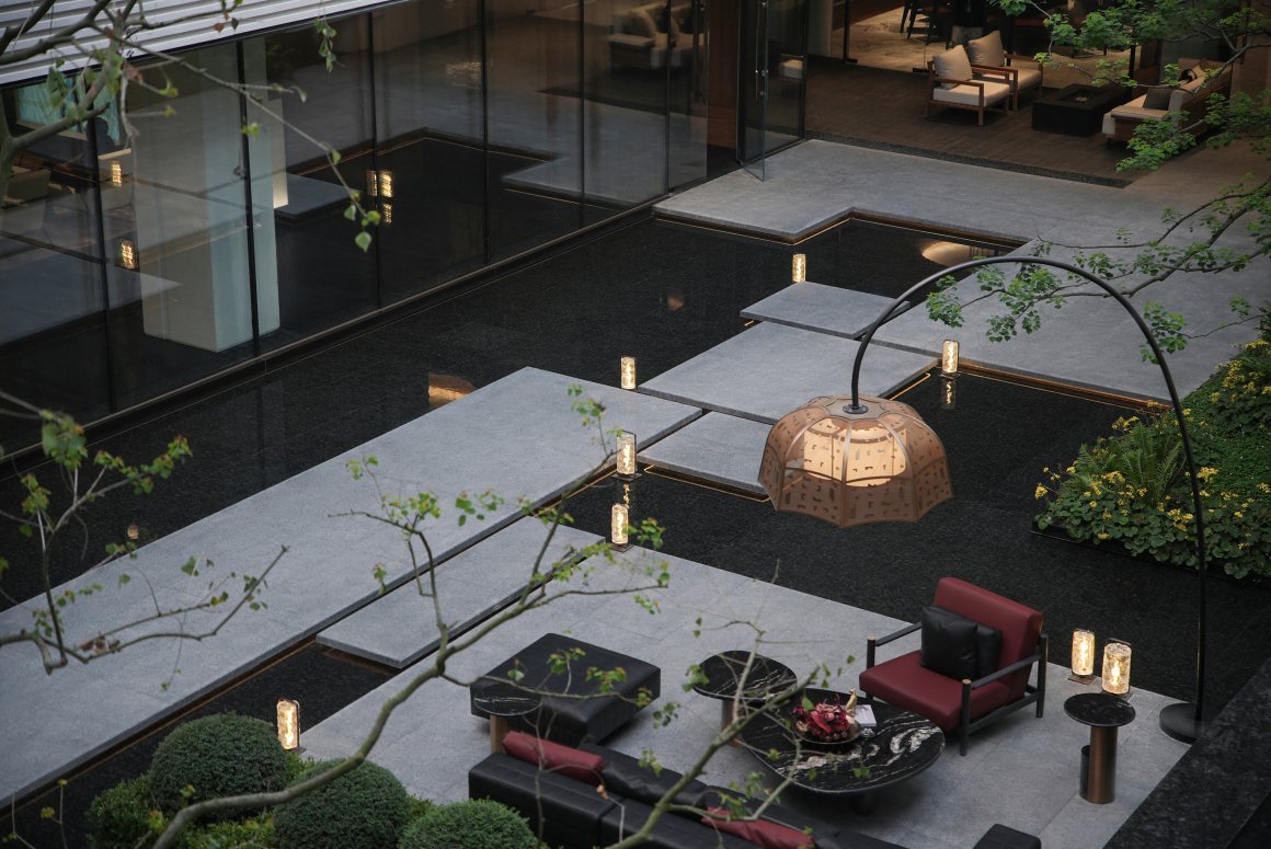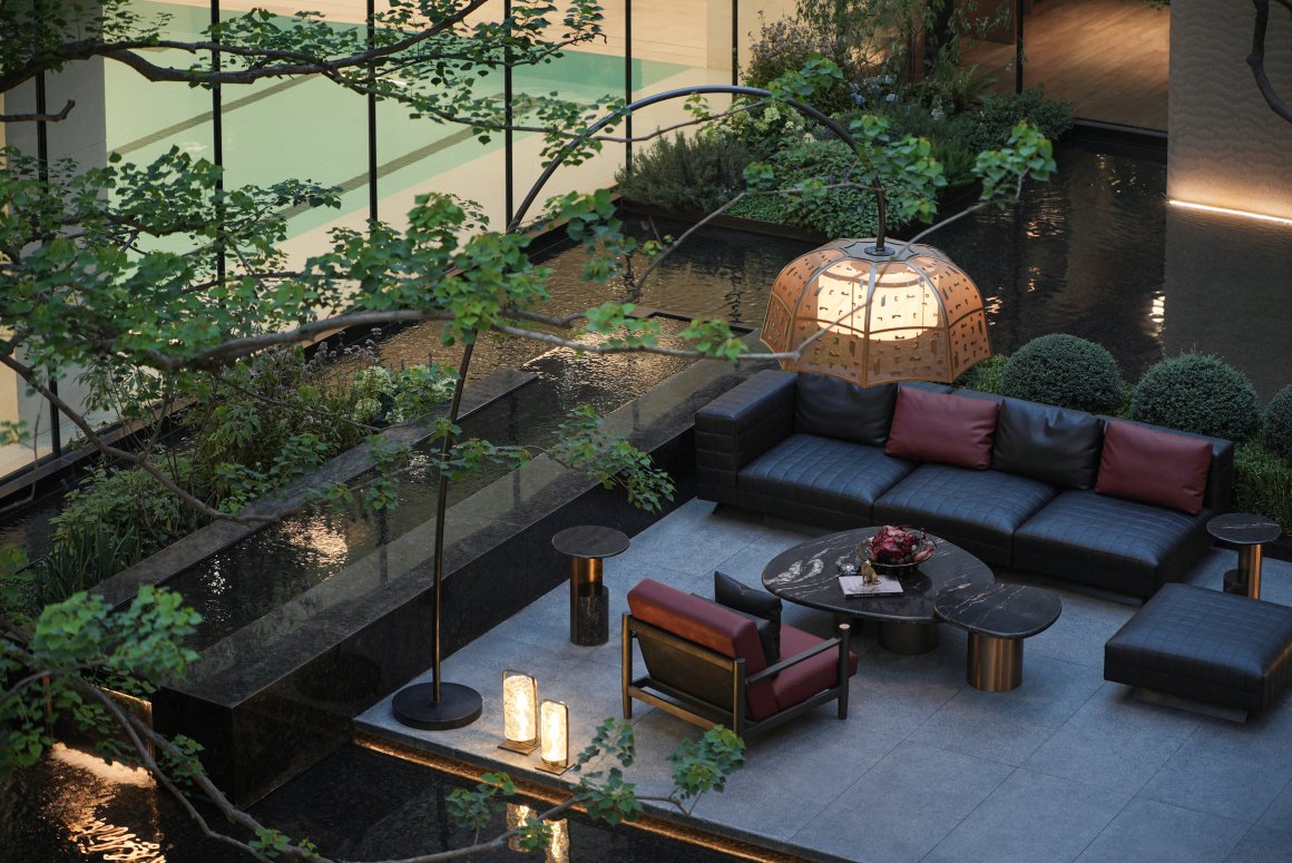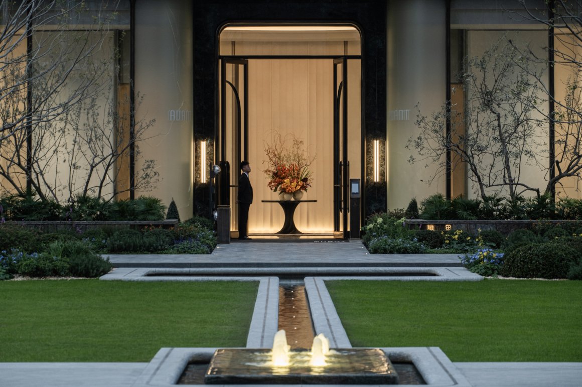 穿越艺术门厅后,随即展开的是宅邸第一进花园,以水院作为载体,串联周围的接待大堂、艺术回廊、花房沙龙会所以及负一层的绿宝石花园形成一个高密度、高显性的花园合院。花园,除了被围合起来体验,也应该能是自由流淌在开放空间里的、生动的生活场景。
