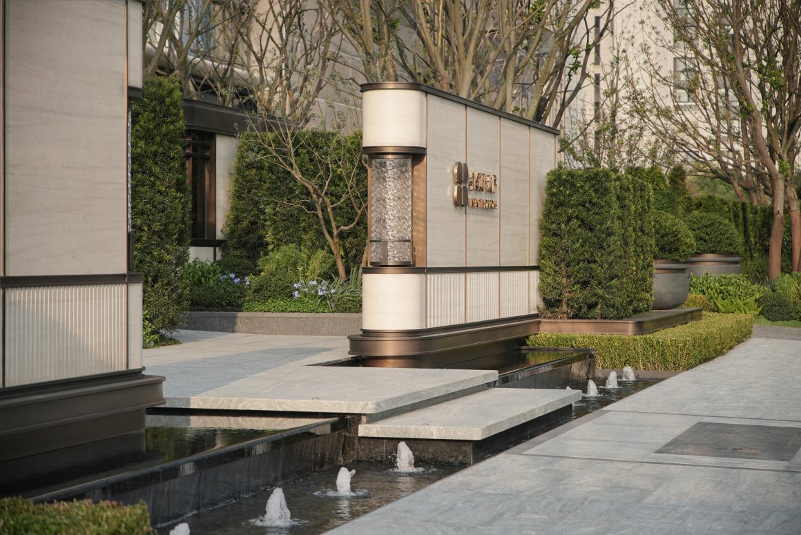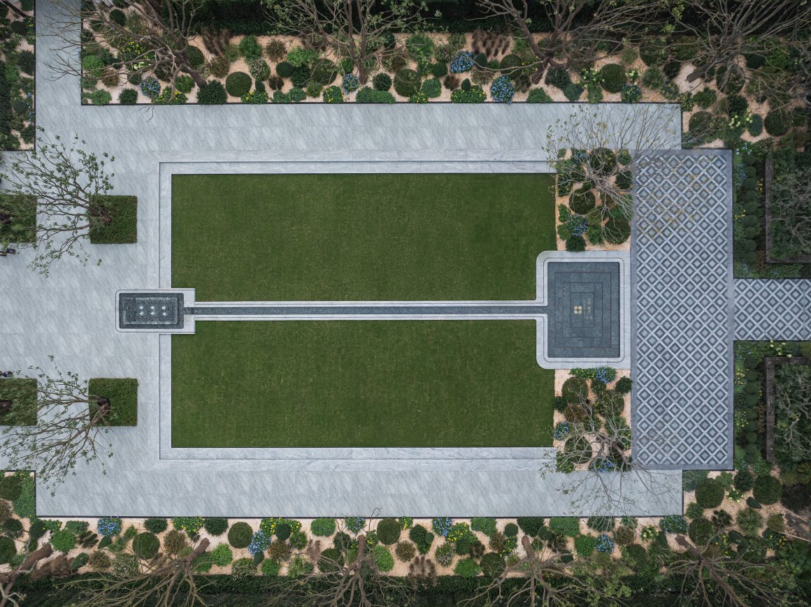 Facing the main building from a distance, the relationship between the water features and the axial lines aligns precisely, showcasing the tranquil and dignified character of the residence. In homage to the progressive vertical details of mansion-style residences, the boundaries of the lawn not only descend vertically but also feature unique curved steps that enhance the sculptural quality of the lawn space.