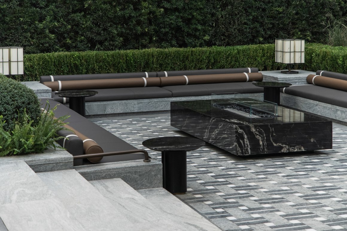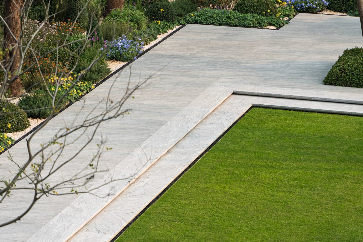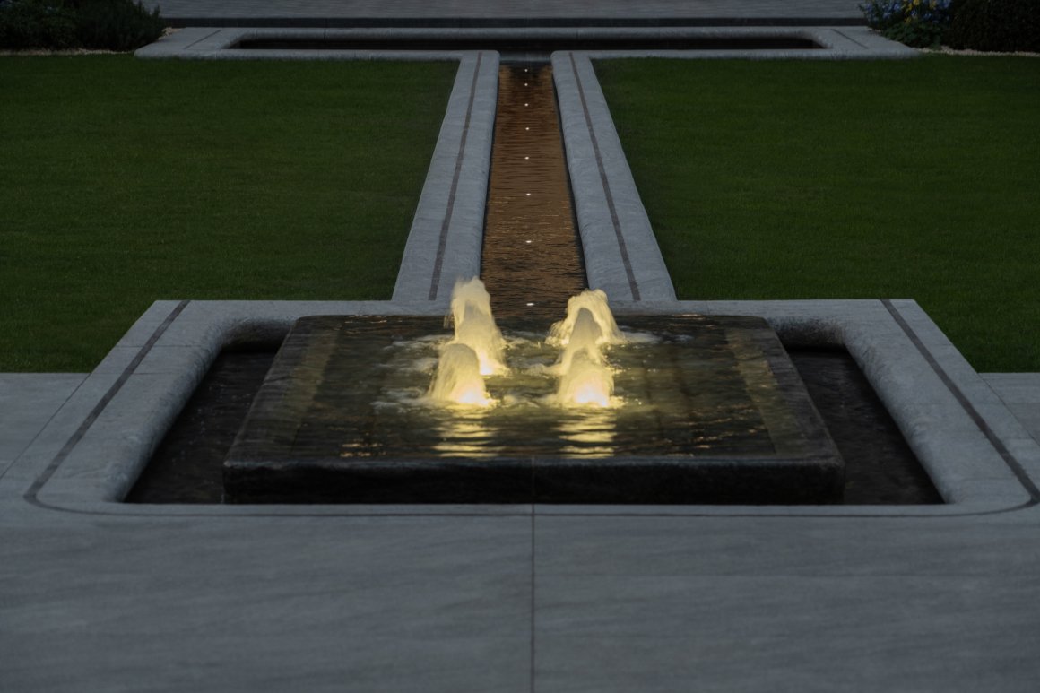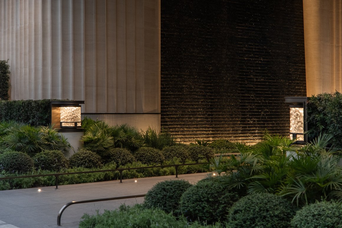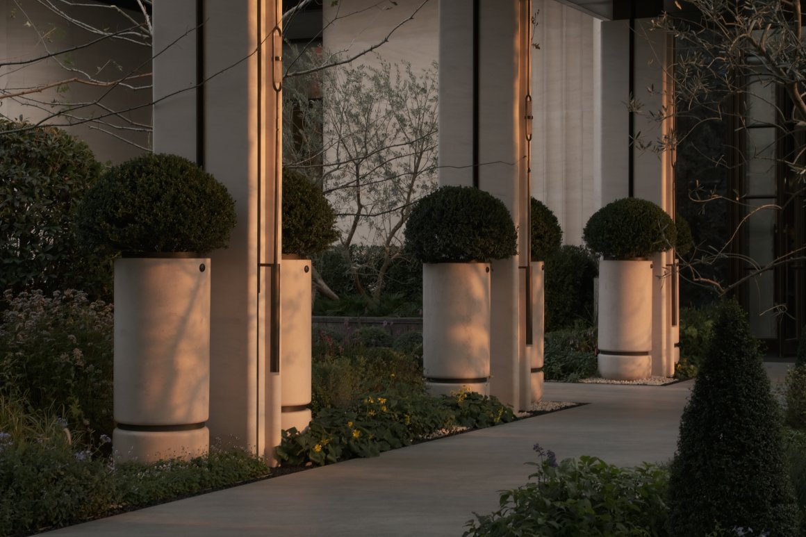 与楼王遥相对视的宴会之茵,水系与轴线关系无不精准对位,展现宅邸静谧大度的气质。致敬公馆宅邸递进式的竖向细节,草坪边界除了竖向下沉,特殊的圆弧台阶也突出了草坪的空间雕塑性。