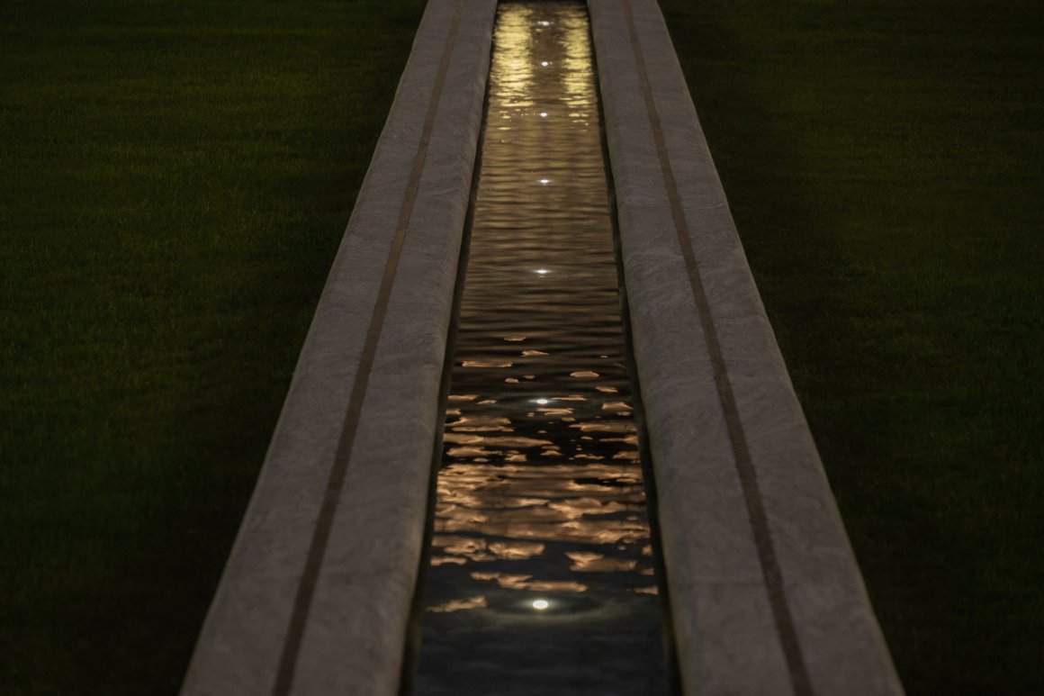 ▽水系反射夜晚的灯光,与池底的水下灯形成有趣的折射关系