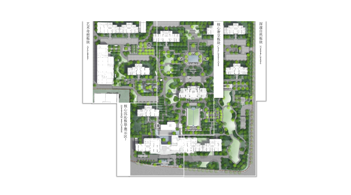 ▽社区由3大板块组成,并在最大化的绿意中嵌套了不同手法的空间组团,形成巨型庄园的构成基础,打造具艺术感、奢享感、自然感的新式海派庄园生活(过程稿,实际以交付为准)