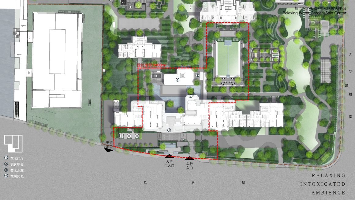 ▽本展示区范围为社区主入口的艺术门厅起始,延伸至正对楼王的宴会之茵,展示绚丽盛宴板块中的奢享沉沁花园群(过程稿,实际以交付为准)