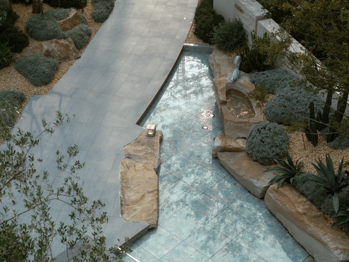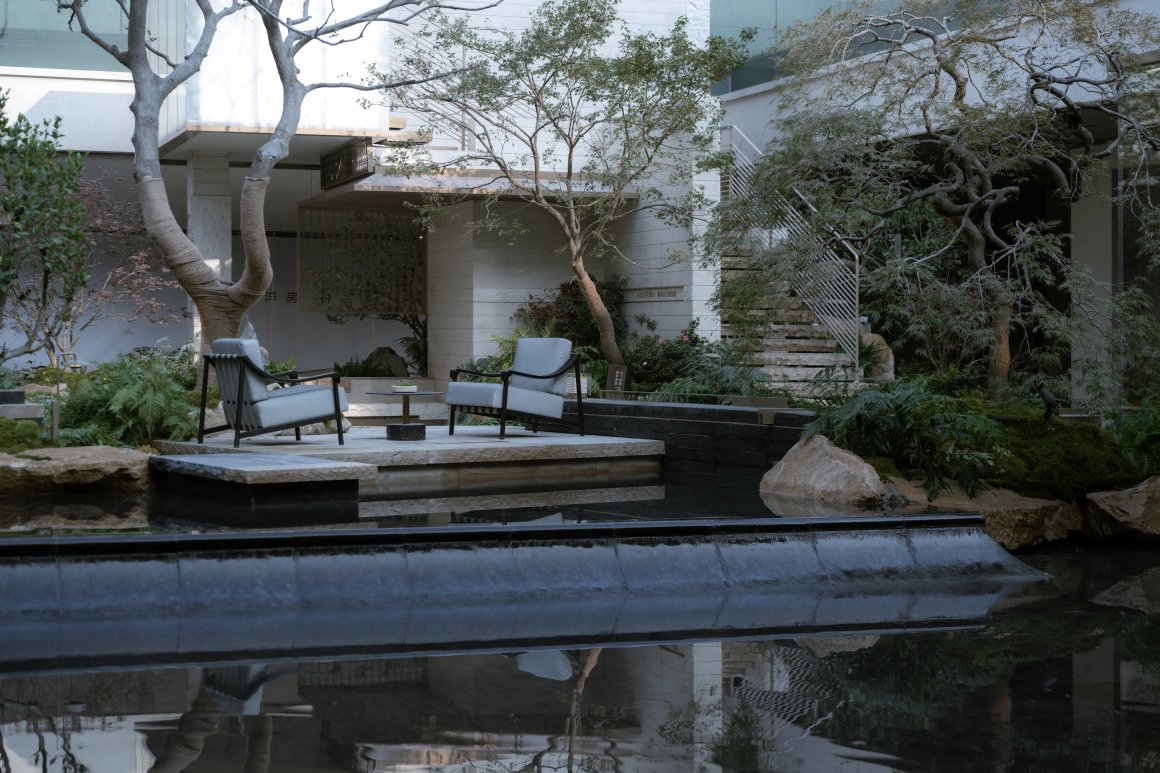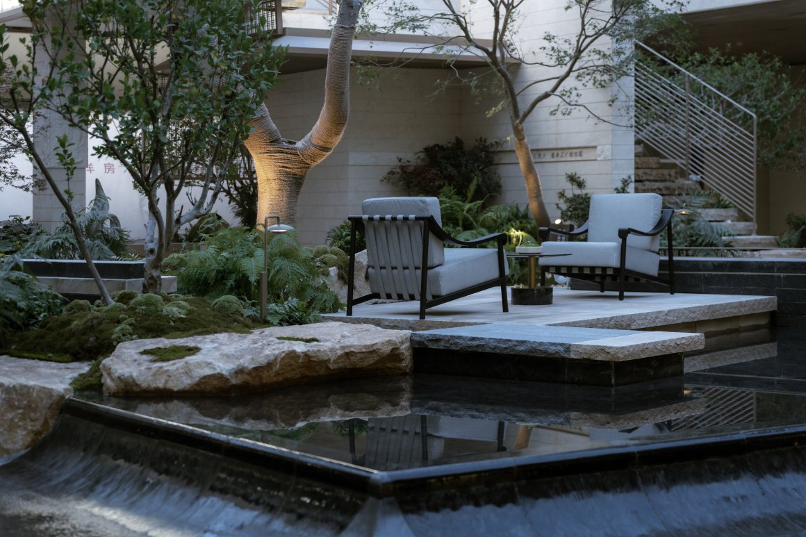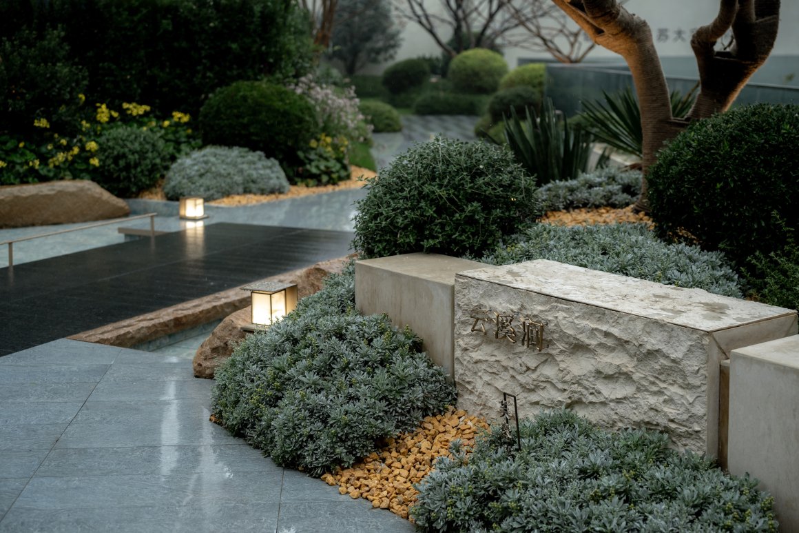 Walking into the four-entry space, a unique frame is formed at the turning point of the flower path, and the scenery stones and flowing water are reflected in it. Walking through the waterscape, the psammophytes on both sides add a sense of art and ornamental value to the courtyard with their peculiar shapes, like natural sculptures, and the artistic wall details create a high-quality rest space, under the backdrop of the waterscape, or meditate, or explore, and taste the quiet and leisurely atmosphere.