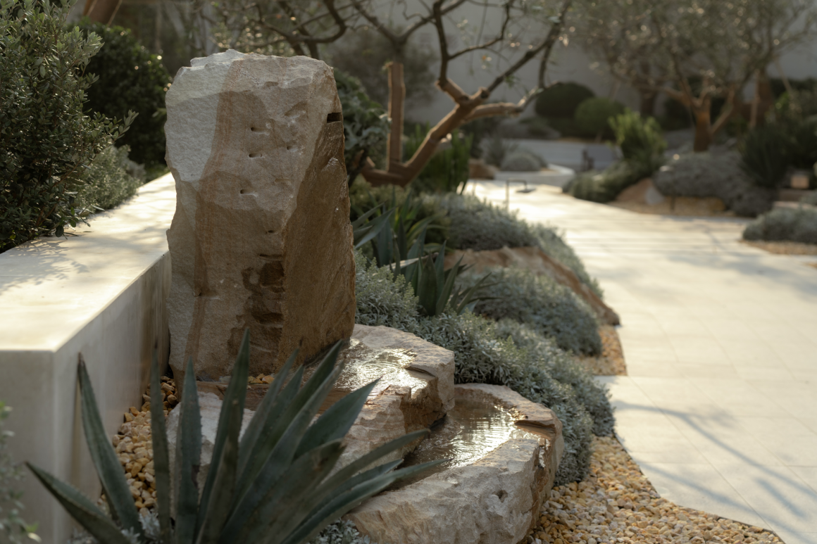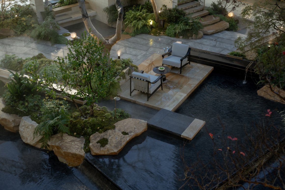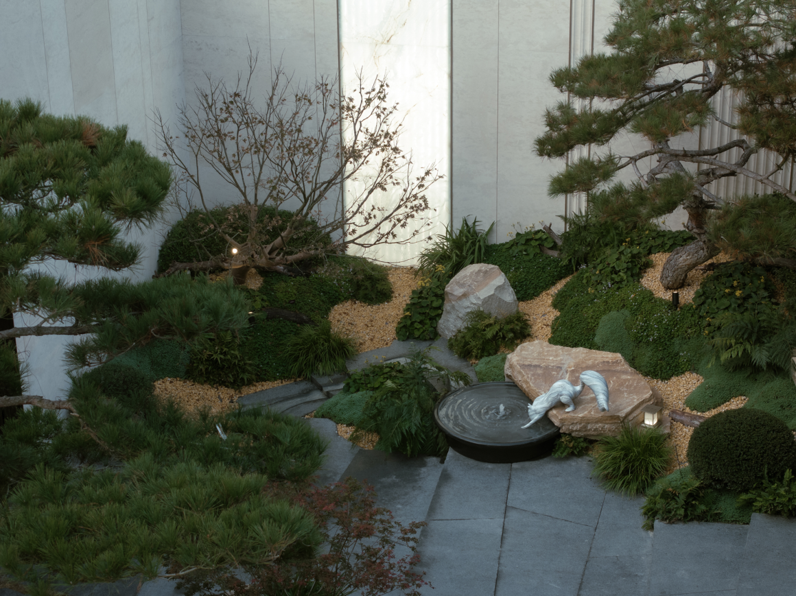 流水潺潺,与置石相拥,景石与植物共同营造出一个静谧的空间意境,为庭院带来一份宁静与清新。