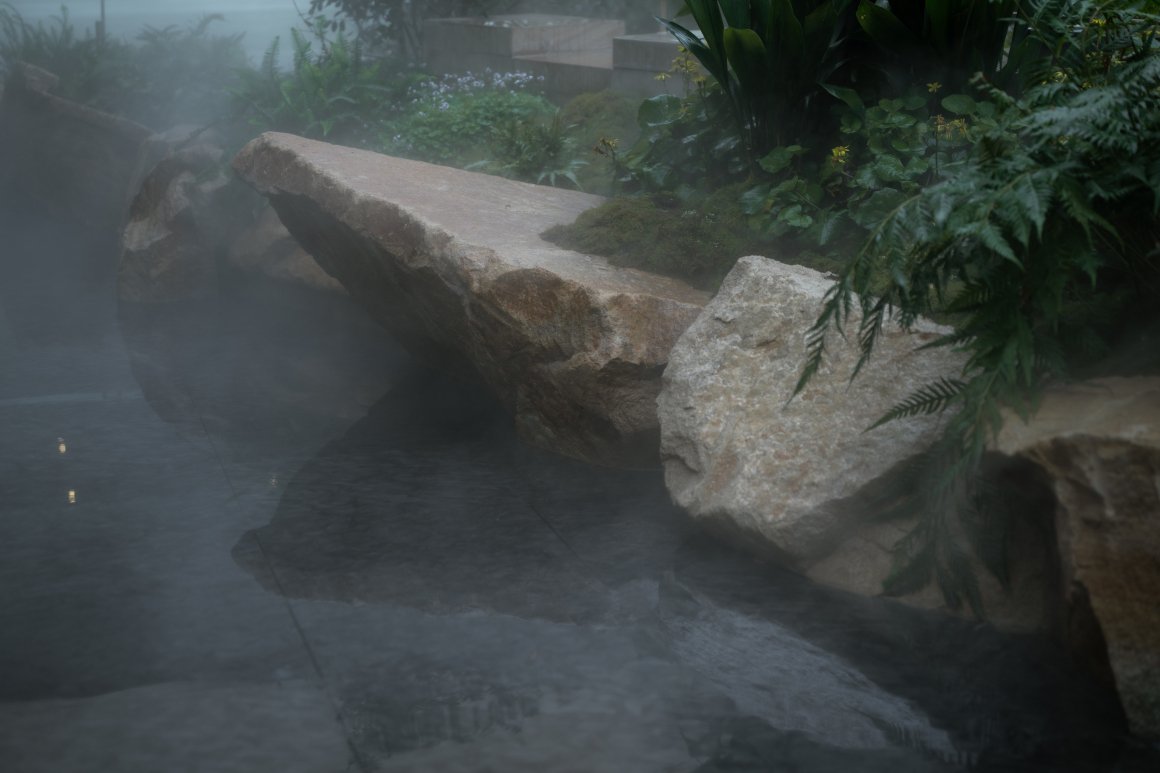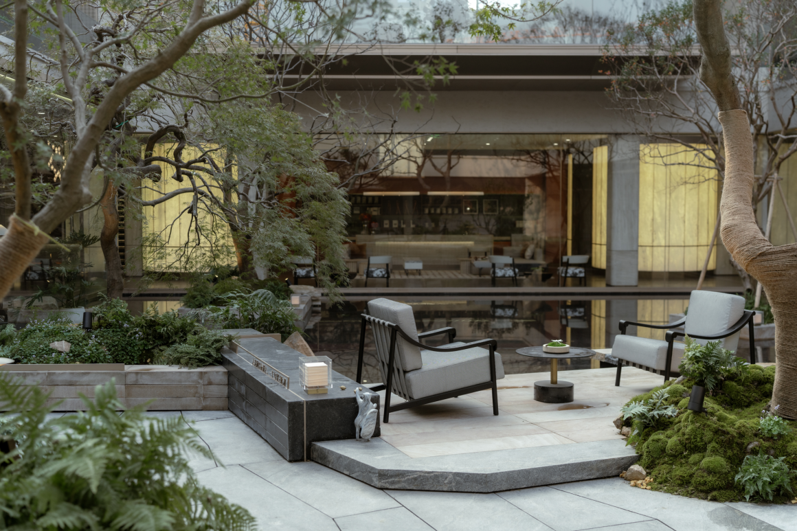 The fusion of tradition and modernity draws on the layout of ancient garden landscaping. The layout first establishes the landscape framework, with water as the main focus and mountains as the auxiliary. Mountains are alive because of water, and water makes mountains beautiful. Going down the steps, thousands of atmospheres are hidden in a small space. Using the original terrain, around the highlights of the atrium, an immersive multi-dimensional three-dimensional space is created to create a 360° boundless landscape view.